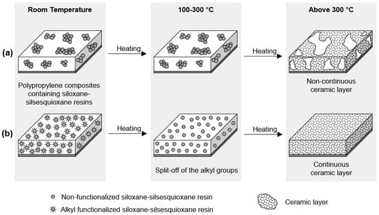 The possible roles of (a) non-functionalized and (b) n-alkyl-functionalized siloxane-silsesquioxane resins during thermal degradation of PP/S4SQ composites.