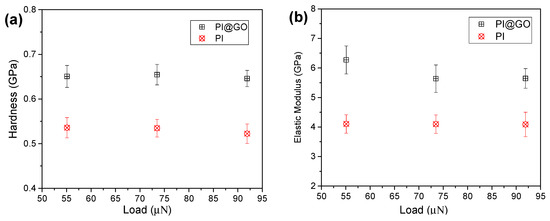 Hardness (a) and elastic modulus (b) of PI and PI@GO composite under different loads.