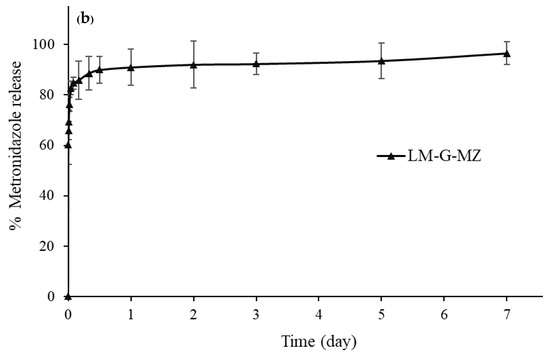 LM-G-MZ film showed a fast metronidazole release at the initial stage, up to 60.26% within 5 min followed by a slow release rate from 60% to 80% in 60 min (Figure 3a). In addition, LM-G-MZ film showed the capability to sustain a slow metronidazole release profile at approximately 92% release until the day 7 (Figure 3b). This two-phase release profile was also correlated with the swelling behavior of LM-G-MZ. On the other hand, the metronidazole release profile of HM-G-MZ film showed a fast release up to 75.37% within 15 min and reached 97.40% in 1 h. As a result, rapid dissolution was observed in HM-G-MZ by the erosion of high methoxyl pectin. However, the cumulative percentage of HM-G-MZ metronidazole release was less than LM-G-MZ film during the first 5 min. This could be explained by the formation of crystalline form of metronidazole on the HM-G-MZ film surface, which exhibited the slower dissolution rate than the amorphous form on LM-G-MZ film surface [24]. According to two different release profiles, it is recommended that the HM-G film is appropriate for immediate release drug delivery system while LM-G film might be recommended for a prolonged release drug delivery system. In the case of metronidazole for periodontal pocket infections, the LM-G-MZ was suitable possibly due to the prolonged release of drug in periodontal pocket to maintain the therapeutic concentration for up to seven days. This would hence increase the therapeutic efficiency of metronidazole in the periodontal pocket where microbial infection is a primary cause and this invented device might also provide a better compliance from dental patients.
