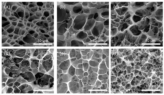 The typical scanning electron microscopy (SEM) images of NC-G and OR-G gels. (a) NC-G0, (b) NC-G20, (c) NC-G40, (d) NC-G60, (e) NC-G80, and (f) OR-G60.