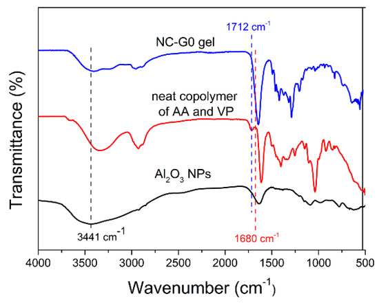 Fourier transform infrared (FTIR) spectra of alumina nanoparticles (Al2O3 NPs), neat copolymer and NC-G0 gel.