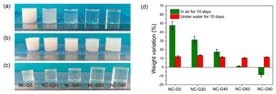 The digital pictures of NC-G gels. (a) As-prepared, (b) immersed in water for 10 days, (c) placed in air for 10 days, (d) weight variation of NC-G gels.