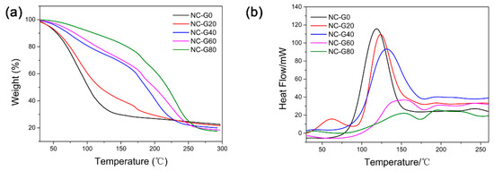 (a) Thermal gravimetric analysis (TGA) and (b) differential scanning calorimetry (DSC) curves of NC-G gels.