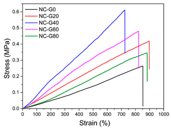 Stress-strain curves of NC-G gels with different glycerol content.