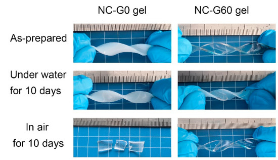 Due to the anti-dehydration and swell-resistant properties as well as the excellent mechanical properties of their as-prepared states, we thought that the NC-G gels could also possess considerable mechanical performance both in air and water environments. Therefore, mechanical tests were conducted on hydrogels after being placed either in air for 10 days or immersed in water for 10 days. As shown in Figure 7, the NC-G0 gels exhibited excellent mechanical toughness after immersion in water for 10 days, and could withstand twisting without breaking. However, after being placed in air for 10 days, the hydrogel became stiff and brittle because of the loss of water within the hydrogels. Thus, the hydrogel was easily fractured upon deformation. In contrast, the NC-G60 gel maintained its outstanding mechanical performance both in air and water, which simultaneously overcame the two long-lasting problems inhibiting the practical applications of hydrogel materials. Based on these findings, we also measured the mechanical properties of hydrogels under different conditions, and the results are summarized in Figure 8. All of the NC-G gels demonstrated similar mechanical properties after immersion in water for 10 days. This is because the glycerol within hydrogels was replaced with water, which causes the different NC-G gels to have similar compositions after immersion in water. Furthermore, as discussed above, the volumes of the NC-G gels shrank 10% after immersion in water due to the increased cross-linking density. Therefore, the tensile strength and elastic moduli of the hydrogels significantly increased, while the elongations at break slightly decreased. Notably, the tensile strength of the hydrogels immersed in water were as high as 1 MPa, making these gels prospective for application in load-bearing systems. As for the hydrogels placed in air for 10 days, their mechanical properties revealed a significant relationship with their glycerol content. For the NC-G0 gel, most of the water evaporated during the 10 days. Thus, no mechanical data could be obtained due to its stiff and fragile nature. When 20% of the water was replaced by glycerol, the NC-G20 gel was still soft after being placed in air for 10 days. It could be stretched more than 200% (234 ± 10.2%) its original length before fracture because of the reduced water loss from the hydrogels, showing tensile strength and elastic modulus around 0.91 ± 0.05 MPa and 520.2 ± 25.6 kPa, respectively. Further increasing the glycerol content led to the increasing in the softness and extensibility of the resultant hydrogels, whereas the elastic modulus gradually decreased. In addition, the tensile strength of NC-G40 gel, NC-G60 gel, and NC-G80 gel after being placed in air for 10 days were measured to be 0.64 ± 0.04 MPa, 0.53 ± 0.03 MPa, and 0.29 ± 0.01 MPa, respectively. These values are almost the same as those recorded in their as-prepared states and comparable to other high-strength hydrogels reported in the literature [33,34,35]. In general, the data displayed in Figure 8 strongly verified that the NC-G gels could be utilized in air and water environments because of their excellent mechanical performance under these conditions.