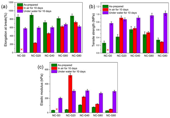 Comparison of mechanical properties of NC-G gels placed in air and under water for 10 days. (a) Elongation at break; (b) Tensile strength; (c) Elastic modulus.