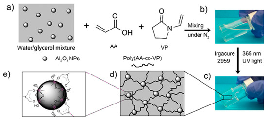 Acrylic acid (AA, >99%) and N-vinyl-2-pyrrolidone (VP, 99%) were purchased from Aladdin Reagent Co., Ltd., Shanghai, China. Glycerol (99.5%) was obtained from Innochem Co., Ltd., Beijing, China. 2-hydroxy-4′-(2-hydroxyethoxy)-2-methylpropiophenone (Irgacure 2959, 98%) was purchased from Energy Chemical Co., Ltd., Shanghai, China. A colloid solution of Al2O3 NPs with particle size of 10–20 nm and solid content around 10% was provided by Wanjing New Materials Co., Ltd., Hangzhou, China. Organic cross-linker N,N′-methylenebis-(acrylamide) (MBA, 98%) was obtained from Alfa Aesar Co., Ltd., Shanghai, China. All the reagents were used as received without further treatment.