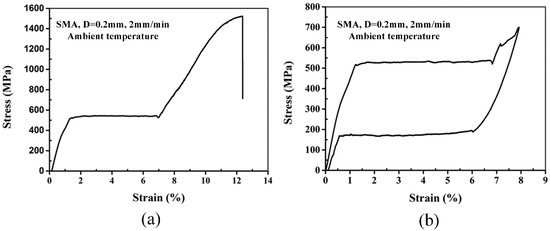 Tensile stress-strain curves of superelastic SMA wires ((a) Representative stress/strain curve of the tensile tests, (b) superelastic deformation of the SMA wire).