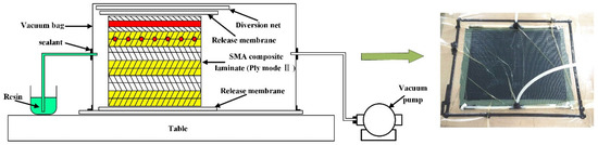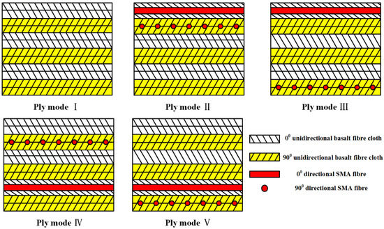 In this study, unidirectional basalt fiber-reinforced composite laminates with and without SMA wires are manufactured by vacuum-assisted resin injection (VARI) process [23]. The basalt fiber-reinforced laminates without SMA are fabricated with a cross-ply configuration of [0°/0°/90°/90°]3, where the 0° and 90° represent the fiber orientation of each ply and the subscript 3 indicates that this lay-up is repeated three times. Lei et al. [24] have pointed out that the weak interface between SMA wires and matrix can result in a decrease of the composite performance, so treatments on the SMA surface are needed to improve the adhesion performance of SMA/matrix interface. To inhibit the debonding of SMA/matrix, efforts to enhance the interface adhesion properties have been reported [25,26,27,28,29]. In this paper, SMA wires are cleaned with acetone to remove macroscopic impurities on the alloy surface, followed by mechanical grinding and polishing with 400 grit papers to change the alloy surface roughness. After the treatments, the SMA fibers are incorporated into the composite laminates with four different modes, the sketches of ply modes are plotted in Figure 2. The ply mode І represents the lay-up of the composite without SMA, the others display the composites embedded with SMA wires. Two perpendicular layers of SMA wires with a volume fraction of 0.82% are embedded into the composites. Each layer of SMA wires with a gap of 0.3 mm is aligned along the fiber orientation of adjacent plies, which makes SMA wires well compatible with adjacent plies upon curing [30]. The specific locations of the embedded SMA wires in composites are also indicated in Table 3.