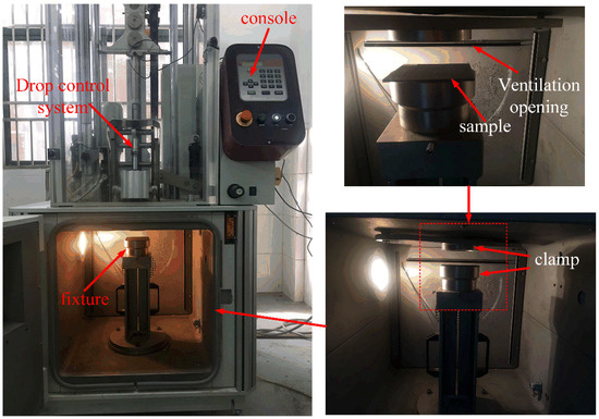 According to the ASTM D5420-2010 standard, low-velocity impact tests are conducted by Instron Dynatup CEAST 9350 (Instron, Norwood, MA, USA) drop weight impact testing machine at room temperature, as shown in Figure 4. The test system contains three parts: the pneumatic clamping fixture, a drop hammer device and a data acquisition system. Specimens are firmly fixed between two circular rings of 76 mm diameter. The steel hemispherical projectile with 16 mm diameter and 3.77 kg mass is adopted for all tests. This projectile is guided through two smooth columns, which prevents the specimens from multiple strikes. During the impact event, the impact force is measured by a load cell located just above the projectile head, and the displacement is acquired by a laser detector attached on the impact frame. In this work, three different incident energy levels, 30, 60 and 90 J are studied, which leads to the impact velocities of about 3.99 to 6.91 m/s corresponding to the common low-velocity impact cases. For each type of composites under the same impact energy, at least three specimens are tested and the mean values are determined.
