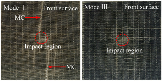 Typical damage morphology of the samples with 30 J impact. Notes: MC indicates the matrix cracking in the figure.