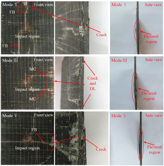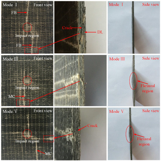 Typical damage modes of the samples with 60 J impact. Notes: in the figure, MC indicates the matrix cracking, FB represents the fiber breakage and DL illustrates the delamination.