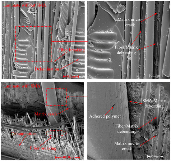 The micro-damage morphology of the impacted samples can be obtained by SEM images, as shown in Figure 8. For the damage laminate without SMA wires, typical damage modes, including matrix micro-cracking, delamination, debonding of fibers from the polymer and fiber breakage, are clearly recorded by the SEM figures of the selected damage region. Besides the damage modes occurring in the reference laminate, the SMA-matrix debonding can be seen in the images of the impacted laminate reinforced with SMA wires. It can also be seen that a large fiber separation and breaking region is observed around the SMA wire and a crack is generated between them.