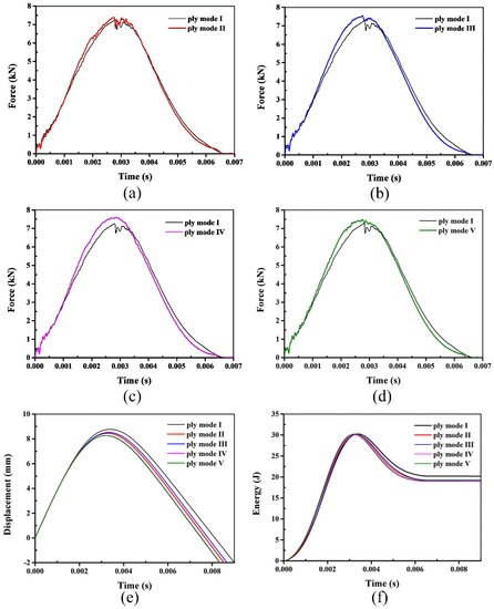 Typical impact behavior of laminates with 30 J (Figures (a–d) show the force-time curves of mode I with mode II, mode III, mode IV and mode V, respectively. Figure (e) and Figure (f) represent the displacement-time and energy-time histories of different modes, respectively).