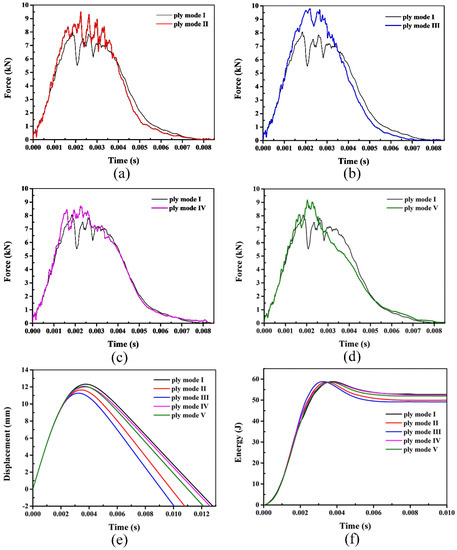 Typical impact behavior of laminates with 60 J (Figures (a–d) show the force-time curves of mode I with mode II, mode III, mode IV and mode V, respectively. Figure (e) and Figure (f) represent the displacement-time and energy-time histories of different modes, respectively).