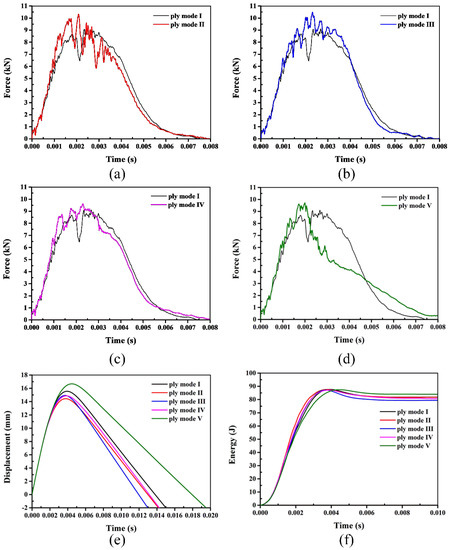 Typical impact behavior of laminates with 90 J (Figures (a–d) show the force-time curves of mode I with mode II, mode III, mode IV and mode V, respectively. Figure (e) and Figure (f) represent the displacement-time and energy-time histories of different modes, respectively).