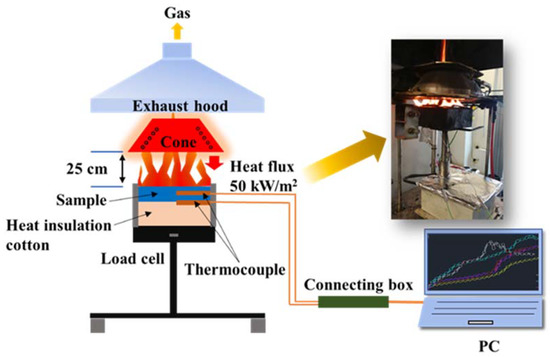 The fire behavior of the samples was determined on a cone calorimeter (FTT, East Grinstead, UK) according to the ISO5660 standard, under a heat flux of 50 kW/m2 with a sample size of 100 × 100 × 3 mm3. The temperature detection was carried out during the cone calorimeter test (CCT) with K-type thermocouple. The sample temperatures at the middle and bottom layers during combustion were monitored. The middle and bottom thermocouples were fixed by the premade hole and sample holder, respectively. Figure 1 shows the experimental setup for cone calorimeter tests and temperature measurements.