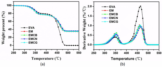 The thermal stability of EVA and its composites with MH and carbon materials was investigated by TGA in nitrogen atmosphere. The TGA and derivative thermogravimetry (DTG) curves of neat EVA and its nanocomposites are plotted in Figure 2, and the corresponding data are listed in Table 2. It was observed that all samples exhibited a distinct two-step decomposition process. The first stage was due to the loss of acetic acid in EVA and the dehydration of MH from 300 to 400 °C. The second stage involved volatilization of the residual polymer and degradation of ethylene-based chains [29,30]. As shown in Figure 2, the pure EVA maximum weight-loss temperature (Tmax1 and Tmax2) for the two decomposition steps was 348 and 428 °C, respectively. Compared with the pure EVA and EM, EM with carbon nanomaterials had a higher initial decomposition temperature (T−5%) and Tmax1 because carbon nanomaterials are highly thermal stable; besides, all char yields had a slight increase, which was higher than 34.5 wt % of EM, indicating that carbon nanomaterials were beneficial in promoting char formation. It should be noted that the thermal stability of EMCB, EMCN, and EMCG EMCN was improved, because the MH with numerous interconnection carbon materials acted as a barrier, hindering the transport of degradation products and promoting the formation of stable charred layers [31].