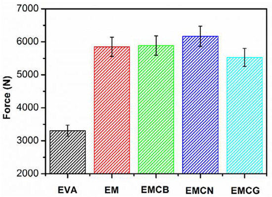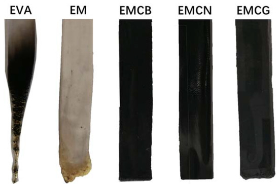 In this part, the influence of different fillers on the mechanical properties of EVA composites was investigated. The detailed data are given in Table 5. As can be seen from Table 5, both the tensile strength and elongation at break of EM and EMC materials significantly decreased compared to neat EVA. Compared with EM, the tensile strength and elongation at break of EMCB and EMCG were nearly unchanged, while for EMCN, both tensile strength and elongation at break slightly decreased compared with EM. This indicated that it had not been adversely affected in mechanical properties when few carbon materials were added into the EM system.