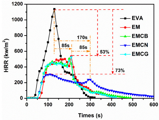From Figure 4, it can be seen that the pure EVA was easily flammable after ignition, exhibiting a sharp peak in the HRR curve at 125 s, with peak value at 1139 kW/m2. When 50 wt % MH was added to EVA, the PHRR of EM decreased remarkably from 1139 kW/m2 of EVA to 536 kW/m2, corresponding to a 53% reduction compared to pure EVA. After carbon nanomaterials were added into the EM system, the EM with carbon samples burned more slowly than pure EVA and EM. Furthermore, compared with pure EVA, EMCB, EMCN, and EMCG composites, the peak of HRR curves decreased from 1139 to 506, 308, and 564 kW/m2, respectively. The PHRR of EMCN was 305 kW/m2, corresponding to a 73% reduction compared to pure EVA and 20% reduction compared to EM. It can also be observed from Figure 4 that pure EVA burned very fast after ignition. The second sharp HRR curve appeared near 125 s. For the sample with MH, its second HRR was delayed to 210 s. With the addition of 1 wt % CB and CG in EM, the time of appearance of the second HRR remained nearly unchanged. However, in the EMCN sample with 1.0 wt % CN, its second HRR was lower than the first peak and was prolonged to 295 s. The HRR of all of flame-retardant samples with carbon materials showed flat progress during burning, which indicates that the carbon materials facilitated the formation of a protective char layer. As a result, the combustion was suppressed. Lower HRR value is crucial for saving lives and assets during a fire. Compared with CB and CG, CN showed better flame-retardant efficiency with MH in EVA matrix.