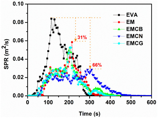 The smoke performance of flame-retardant material is a very important parameter [34]. The SPR values of EVA and EVA-based composites are illustrated in Figure 5. It was seen that EVA had a high peak SPR value of 0.084 m2/s. With the addition of 50 wt % MH, the peak SPR value of EM decreased dramatically to 0.058 m2/s, corresponding to a 31% reduction compared to pure EVA, while in the presence of carbon nanomaterials, the peak SPR values of EMCB, EMCN, and EMCG composites further decreased from 0.058 m2/s of EM to 0.053, 0.029, and 0.052 m2/s, respectively. The results indicate that CN gave rise to the best suppression effect on the smoke production of EM compared with CB and CG.