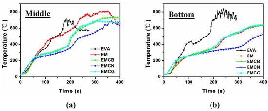 As shown in Figure 6a, the middle of the thermocouple detected the approximately similar increase in temperature for EVA and the EM composite. The EMCB and EMCG composites showed similar and nonsignificant differences during combustion. It is worth noticing that the temperature curve of EMCN was lower than other curves after approximately 50 s of burning. This was because the barrier layer had not formed on top of the specimen, and it did not effectively block the heat transfer at the initial combustion stage. In Figure 6b, it can be seen that the increased temperature rate of EVA was higher than that of EVA composites after approximately 50 s; EM, EMCB, and EMCG temperature curves coincided during burning; and the EMCN temperature curve appeared lower after approximately 125 s. With the development of the combustion process, a heat barrier was formed by MH and carbon materials. Consequently, the char layer had a stronger and stronger effect on combustion and delayed the temperature increase in the deeper parts of the specimen. Compared to EM, EMCB, and EMCG, the char of EMCN presented a better barrier effect. Based on the above cone calorimeter test results of residue, the better barrier effect of the residue mass was stronger than other samples.