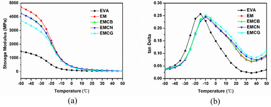 Temperature dependence of (a) storage modulus and (b) tan δ of pure EVA and its composites.