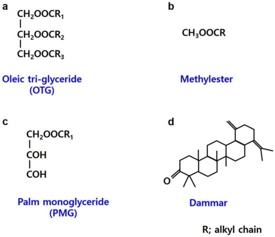 Schematic diagram of diverse oils (a) Schematic diagram of palm oil (oleic tri-glyceride). (b) Schematic diagram of methylester oil. (c) Schematic diagram of palm monoglyceride oil. (d) Schematic diagram of dammar oil.