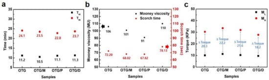Also, Mooney viscosity is commonly used as an indicator of processability for elastomer materials. The OTG/P reduced the Mooney viscosity and apparent shear viscosity of the elastomer composites, which facilitated the manufacturing process of the elastomer composites, as indicated in Figure 2b.