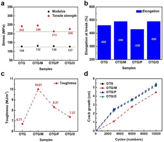 Furthermore, the elongation at the break of the SBR with OTG/M (490%) shows it had enhanced properties compared to the SBR with OTG (460%), as shown in Figure 3b. The increased reinforcement can be attributed to enhanced interfacial adhesion between the fillers and elastomer, and restriction of the motion of the elastomer segmental chains by the improved dispersion of the fillers within the elastomer by the OTG/M. Figure 3c also shows a comparison of the toughness of the SBR composites compared to those of other oil composites. The toughness (area under the stress–strain curve) of the SBR/OTG and the SBR/OTG/M nanocomposite were 6.71 and 10.01 MJ/m3, respectively; the SBR/OTG/M nanocomposite exhibited a toughening effect as high as 49%. The tensile strength, elongation and toughness of the SBR composite at 3 phr OTG/M loading was much higher than those of other composites. This indicates that an applied mechanical load may transfer to fillers through interfacial interactions and uniform dispersion [17].