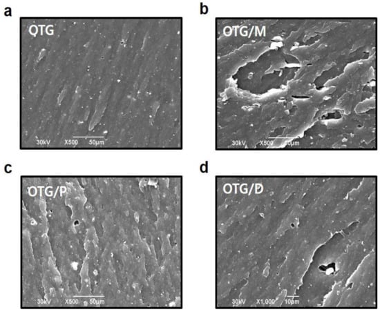Scanning electron microscopy (SEM) provides direct evidence for evaluating the dispersion of fillers and phase morphology correlated with the mechanical properties of elastomer composites. The SEM images of the fracture elastomer composites are exhibited in Figure 4a–d. The SBR composites with OTG/M had a roughened fractured surface, indicating stronger interfacial adhesion between fillers and SBR matrix. Also, the fillers dispersed in the elastomer matrix are shown in the SEM images.