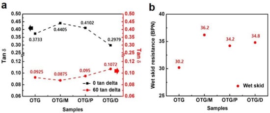 Generally, dynamic mechanical properties are important because many engineering elastomers are subjected to dynamic loading. The dynamic mechanical properties (DMA) of elastomer composites, such as tan δ (tan δ is defined as the ratio of loss modulus to storage modulus) of the SBR composites with diverse oils versus temperature, respectively, are depicted in Figure 5a. The DMA test showed the resulting physical properties of the elastomer. This is often used to predict both rolling resistance and wet traction properties. With the addition of OTG/M, the tan δ of 0 °C was about 18% higher than that of SBR/OTG, as seen in Figure 5a, indicating pneumatic grip tire performance. Also, in Figure 5a, the 60 °C tan δ of the pneumatic tire with OTG/M was about 6% lower than that of the SBR with OTG. Generally, the lowering of tan δ at 60 °C correlates to an improved rolling resistance tire using OTG/M, which has great potential for improving wet performance. Also, the wet skid resistance result supports the DMA results of the elastomer composites in Figure 5b. The wet skid resistance of SBR/OTG/M exhibited a remarkable increase due to enhanced wet traction. Furthermore, these results are consistent with the mechanical properties of the composites in Figure 3.