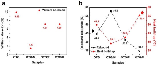 The abrasion properties of SBR composites with different oils are shown in Figure 6a. For the SBR composites with OTG/M, the William abrasion property was improved by enhancing the dispersion of fillers in the elastomer matrix. Furthermore, the abrasion of the composites using OTG/M was much lower than that of OTG, implying effective alleviation of heat build-up and the damping capability of the SBR systems. In Figure 6b, it was found that the SBR nanocomposites using OTG had the lowest heat build-up of 39.1 °C; the SBR/OTG/D nanocomposite with large molecules of dammar had a higher value of 55.4 °C, while the rebound properties of elastomer composites showed the opposite tendency. The heat build-up and rebound results also support the abrasion results of elastomer composites.