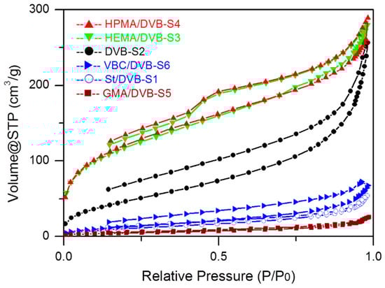 N2 sorption isotherms of POPs synthesized with different HEMA/VBC/DVB molar ratio.