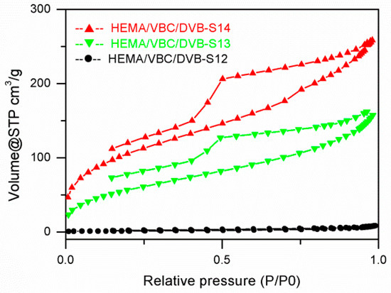 Two functional comonomers, HEMA and VBC (or styrene), with different thermal compatibility with the dispersion solvent were used to tune the pore structure, bulk density, and particle morphology. The pore structure of the prepared PDVB-based POPs with dual functional comonomers could be controllable by tuning the HEMA/VBC/DVB molar ratio. Three samples of POPs (Samples 12, 13, and 14) were synthesized in different HEMA/VBC/DVB molar ratios, and three types of nitrogen isotherms were obtained as seen in Figure 4. When the functional comonomer VBC was in a relatively high molar ratio, the comonomer systems are inhomogeneous in ethanol dispersion solvent due to the bad solubility of VBC, so Sample 12 wasn’t synthesized in dispersion polymerization, but in suspension polymerization, and nonporous isotherm was obtained with relatively high bulk density 0.33 g/cm3. By decreasing the VBC molar ratio, the HEMA/VBC/DVB systems could be homogeneously dispersed in ethanol, and porous isotherms were obtained in Samples 13 and 14.