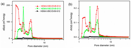 NLDFT simulation of pore structure of POPs (Samples 12/13/14) from dual functional comonomers. (a) Pore-size-distribution curves of dS(d) vs. d and (b) dV(d) vs. d.