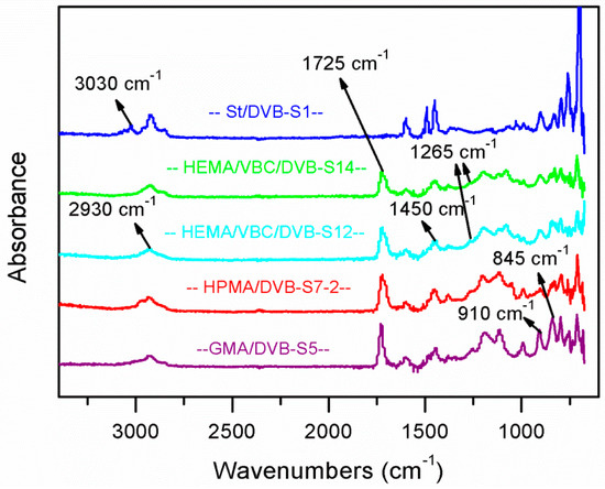 The IR spectra of the five prepared functionalized PDVB samples (1, 5, 7-2, 12, and 14 with St, GMA, HPMA, HEMA/VBC, and HEMA/VBC as functional comonomers, respectively) are shown in Figure 7. We can observe that the bands in 1450 and in 2930 cm−1 exist in all these samples which is the inplane-bending or twist-bending mode, and the stretching vibration of (C–H) of methylene(–CH2–), respectively. The peak around 1725 cm−1 is the sketching mode of C=O in the 4 samples (5, 7-2, 12, and 14) with GMA, HPMA, and HEMA units in their own network. Generally, the bands in 1450 and in 2930 cm−1 can be used to calibrate relative content of the C=O functional group in these functionalized PDVB samples by peak area or peak height contrast with the peak around 1725 cm−1 [38,39]. Furthermore, the peak in 3030 cm−1 due to the stretching vibration mode of (C–H) inbenzene was observed obviously in the P(St-co-DVB) Sample 1. In the GMA-functionalized PDVB (Sample 5), except from the peak around 1725 cm−1, the bands around 910 and 845 cm−1 were also observed, which are the characteristic peaks of the asymmetic vibration of the epoxy group of GMA units, and the lack of absorbance in the range from 3600 to 3200 cm−1 proved that GMA units are incorporated into the P(GMA-co-DVB) network by C=C double bond, not by ring-opening polymerization of the epoxy group in GMA. In the P(HEMA-co-DVB-co-VBC) systems (Samples 12 and 14), the peak around 1265 cm−1 could be attributed to the characteristic absorption peak of methyl chloride linked to benzene ring, and this peak was stronger in Sample 12 than in Sample 14 due to the higher adding ratio of the VBC comonomer.