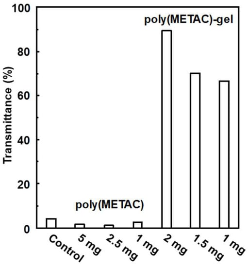Next, poly(METAC)-gels were tested on their abilities to induce bacterial aggregation, precipitation, and cell-death. The poly(METAC)-gels-1.28 were prepared via redox polymerization using N,N′-methylenebis(acrylamide) as a cross-linker [25]. Figure 2 shows the transmittance changes of B. subtilis suspensions treated by poly(METAC) or poly(METAC)-gel-1.28 after 24 h. The control showed that less than 5% of the observed transmittances were due to the suspended B. subtilis. Similarly, less than 5% of the observed transmittances of the B. subtilis suspensions were due to the adding of the poly(METAC) solution, which were similar to control. On the other hand, the transmittance tended to increase with the amount of poly(METAC)-gel-1.28, and reached 90% with 2 mg of the gel. The weak bacterial aggregation/precipitation in the presence of poly(METAC) is caused by the electrostatic repulsion of the adsorbing poly(METAC) on the bacterial surface. The bacteria trapped on the poly(METAC)-gel-1.28 cannot be re-suspended via the electrostatic interaction between the anionic bacterial surface and cationic gel surface, resulting in the high transmittance values. In the nonionic poly(2-hydroxyethyl methacrylate (HEMA))-gel, the transmittance was lower than 5% (Figure S1). The interaction of nonionic poly(HEMA)-gels with bacteria was smaller than that of the cationic polymers. Similar results were reported by Berlutti’s group [26]. Williams et al. prepared poly(METAC)-based cationic temperature-responsive gels, which show bacteriostatic and bactericidal properties against S. aureus when compared with that of nonionic gels [27].