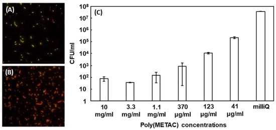 LIVE/DEAD test of E. coli in (A) milliQ and (B) 1 wt % of poly(METAC). The E. coli were stained with SYTO9 and PI. (C) The survival test of E. coli in the presence of poly(METAC) at different concentrations. The exposed E. coli by poly(METAC) were washed using phosphate-buffered saline (PBS) and were spread on medium to count the number of survived E. coli cells.