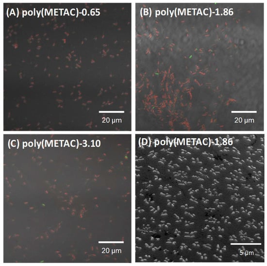 Next, the biocidal ability of the poly(METAC) and poly(METAC)-gels was investigated. Figure 3 shows the LIVE/DEAD test of E. coli in the presence of MilliQ (Figure 3A) or 1 wt % of poly(METAC) (Figure 3B). The E. coli were stained with SYTO9/PI, which leads to the exhibition of red fluorescence by the death cells due to the treatment with poly(METAC). In another experiment, E. coli were exposed to poly(METAC) at different concentrations (10 mg/mL–41 μg/mL), spread on the nutrient agar, and the colony forming units (CFUs) were measured after 24 h. Figure 3C shows the CFU at each poly(METAC) concentration. CFUs decreased with increasing poly(METAC) concentration, and reached a plateau (about 100 CFU/mL) at over 1.1 mg/mL. The prevention of the E. coli growth by poly(METAC) was about 0.4 million-fold higher than that of the control without poly(METAC). Adsorbed bacteria on poly(METAC)-gels were observed by the confocal microscopy. The poly(METAC)-gels were immersed in the E. coli suspension for 10 min, and were washed 2 times with large amounts of pH 7.4 PBS. The bacteria on the poly(METAC)-gels were stained with the live/dead agent. Figure 4A–C shows confocal microscopy images of the poly(METAC)-gels with different cross-linker amounts, 0.65, 1.86, and 3.10 mol %. Almost all bacteria on the poly(METAC)-gels were dead as shown by the red fluorescence. The adsorbed bacteria were also observed by scanning electron microscopy (SEM) measurement (Figure 4D). He et al. prepared a cationic hydrogel film via a light-triggered cross-linking [28]. The antimicrobial activity against E. coli was shown to depend on the amount of the ethylene glycol-based cross-linkers. At 20% of cross-linking degree, approximately 100% of antibacterial activity was reached. Yang et al. prepared a hydrogel consisting of METAC and nonionic monomers bound by disulfide bonds, and the gels successfully prevented the adsorption of proteins and E. coli on the surface [29]. The physical destruction of the adsorbing E. coli on the gel surface was observed via SEM measurement. Other nonionic polymers such as ethylene glycol-based copolymers also can prevent the adsorption of bacteria [30,31]. The METAC is a methacrylate type of monomer and the polymeric structure can be easily controlled via a combination of living radical polymerizations and click chemistry. The antibacterial properties will be customized by the structural formulation of poly(METAC).