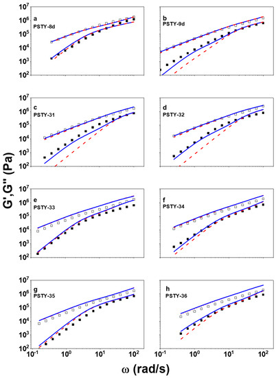 In Figure 1, two model predictions, with (ϕmulti_c = 0.91, ϕlinear = 0.09) and without (ϕmulti_c = 1, ϕlinear = 0) contribution of linear contaminants, are plotted along with data. For the case of ϕlinear = 0, the prediction significantly underestimates the terminal storage moduli of samples PSTY-9d, 31, and 32, which do not have inner loops. However, if the linear contamination is considered, the predicted storage moduli are increased and almost perfectly match the experimental data. This supports the existence of linear chains contaminants, even though they are not unambiguously resolved in log-normal distribution (LND) fits [41]. In addition, we note that comparison of Figure 1a,b suggests that the linear viscoelastic spectra of linear PSTY-8d and cyclic PSTY-9d are almost identical. To a first approach this is odd, as even at this molecular weight the linear is slower compared to the ring, as demonstrated with different polystyrenes which have been purified via LCCC [31,32]. However, as shown in Table 1, and discussed above, PSTY-9d contains about 9% linear contaminants with double molecular weight. These linear impurities significantly broaden the terminal regime of PSTY-9d, as illustrated in Figure 1b, which compares modeling predictions with (blue solid curve) and without (red dashed curve) considering them.