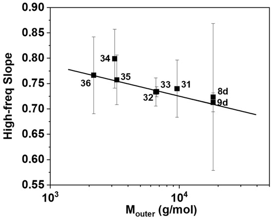 The high-frequency slope as function of outer ring molecular weight Mouter. The solid curve is a linear fit with slope −0.06. Here, the molecular weight of PSTY-8d is treated as Mouter. Error bars reflect standard deviations from each fit.