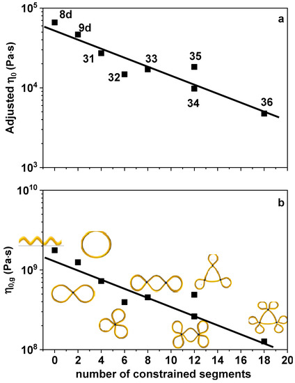 The zero-shear viscosities η0 are extracted from the LVE data of Figure 1, typically by Carreau-type fitting, η*/η0 = [1 + (τ0ω)2](n−1)/2 [61], with η* being the complex viscosity, ω being the angular frequency, η0 being the fitted zero-shear viscosity, and τ0 and n being fit parameters. The thinning exponent was around −0.7. In particular, we found n = −0.68, −0.74, −0.70, −0.72, −0.72, −0.78, −0.70, and −0.74 for PSTY-8d, 9d, 31, 32, 33, 34, 35, and 36, respectively. The η0 values are then adjusted to isofrictional conditions based on the segmental times of Ref. [42]. First, all viscosities are adjusted to the same monomeric frictional state as the linear precursors (PSTY 8d) by multiplying by a factor τseg,8d/τseg,X, where the subscript X represents the sample code of the multicyclic polymer. Inspired by the analysis of segmental dynamics [42], we plot in Figure 3a the adjusted η0 as function of the number of intramolecular constrained segments in the vicinity of linkers. The number of intramolecular constrained segments is defined as the number of segments in the vicinity of linkers, which was defined in Ref. [42]. It can be directly read according to the structure of polymers. For example, in PSTY-31 the number of constrained segments is four. A monotonic decrease is observed and represented by an equation of the form η0 = A × 10(B×constraint), which provides the best fitting result, where constraint represents the number of constrained segments, and A and B are adjustable parameters with B = −0.057 and A = 5.25 × 104 Pas. Alternatively, the viscosities at 403 K can be adjusted with respect to their values at respective Tg of each sample, which is achieved by means of an adjustment factor τseg,g/τseg,403 K, with τseg,g and τseg,403 K being the segmental relaxation times at Tg and 403 K, respectively. We plot the viscosities at Tg, η0,g, as functions of number of constrained segments in Figure 3b. Since all multicyclic rings have identical total molar mass (Table 1), with increasing constrained segments, the loop size becomes smaller and, due to the dilution effects this results in a decrease of η0,g. A line in the log-linear plot of the form η0 = A × 10(B×constraint) with B = −0.057 (same as before) and A = 1.41 × 109 Pas, represents the best fitting result. The clear scaling of the adjusted viscosity with constraints is encouraging and suggests that it is possible to molecularly design more complex multicyclic structures with tunable rheology.