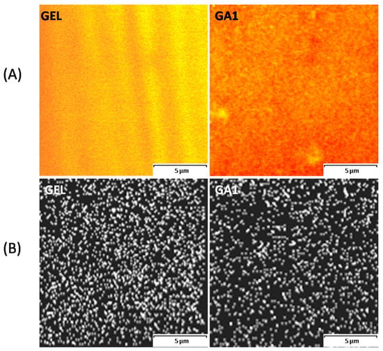 Comparison of the acridine orange distribution (A) and nitrogen distribution (B) in GEL and GA1 films. Scale bar—5 µm. The stripes on the GEL image (A) are the result of the slightly uneven thickness of the investigated film.