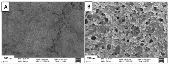 Pore formation during acid treatment of the films: GA2 without carrageenan (A) and GA3containing 1.5% carrageenan (B). Scale bar—1 µm.