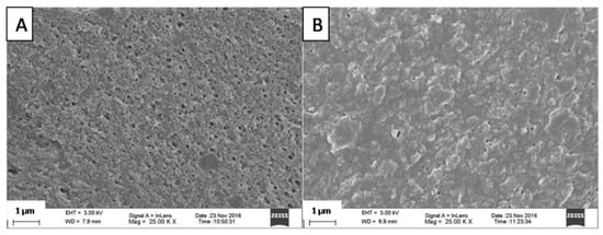 The SEM image presented in Figure 2A demonstrates the smooth surface of the GA1 film, without any visible pores. The microstructure of the film is clearly different after contact with 0.1 M HCl (Figure 2B). The acid treatment resulted in a structure resembling a network of agglomerated particles with a considerable porosity visible.