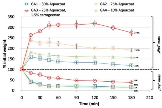 The data in Figure 4 shows that, depending on the Aquacoat content in the films, different swelling behavior was observed, with a less intensive effect being detected if the fraction of gastro-resistant polymer increased. During the swelling test, after an initial increase in the mass of the samples, a subsequent reduction in the weight was observed, which can be explained by the gradual rinsing out of the soluble components from the films. The process was delayed, however, in films containing carrageenan, as the weight of the sample was reduced only after 150 min.