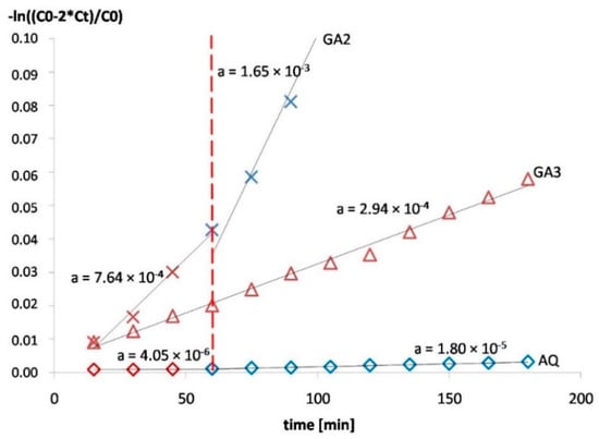 After plotting the concentration gradient logarithm against time (Figure 5) it became visible that two stages can be distinguished in the diffusion process, with a slower diffusion of tritium-labeled water within the first 60 min (Table 3). This was not the case, however, for the composition additionally modified with carrageenan (GA3).