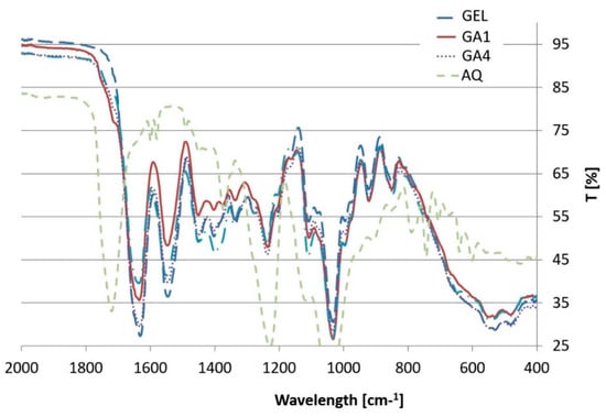 FTIR spectra of bovine-gelatin based formulations (GEL, GA1, GA4,) and spectrum of the AQ film.