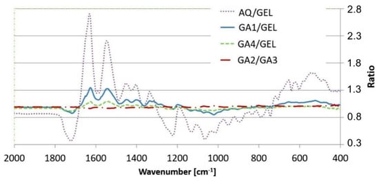 The spectra were compared by calculating the peak intensity ratio [32]. The peak intensity ratio data correlates well with the Aquacoat content in the modified film samples and changes along with increasing content of the Aquacoat in the compositions (Figure 7). At 1718 cm−1, an intensified signal of carbonyl most likely comes from the acid group. The difference at 1626 cm−1 and 1540 cm−1 may represent weaker signals, respectively, from bending vibrations of amide I and II N–H bands of the gelatin chains.